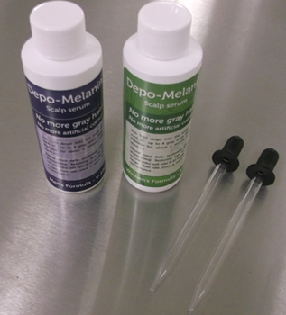 Depo-melanin is a 100% drug free hair serum that is formulated with the main ingredients of pseudocatalase and catalase, which is scientifically proven to prevent gray hair (REFERENCES: A study published in The FASEB Journal (Journal of the Federation of American Societies for Experimental Biology) has showed that a Pseudocatalase or PC-KUS, can return pigment to hair. The pseudocatalase or PC-KUS removes the hydrogen peroxide build up from the follicle, reversing the greying process, researchers found. Researchers treated 2,411 patients and noticed the pigment of the skin and eyelashes returned. Depo-melanin contains the active ingredients of pseudocatalase and natural catalase to reverse the graying process. Article details: J. M. Wood, H. Decker, H. Hartmann, B. Chavan, H. Rokos, J. D. Spencer, S. Hasse, M. J. Thornton, M. Shalbaf, R. Paus, and K. U. Schallreuter.)