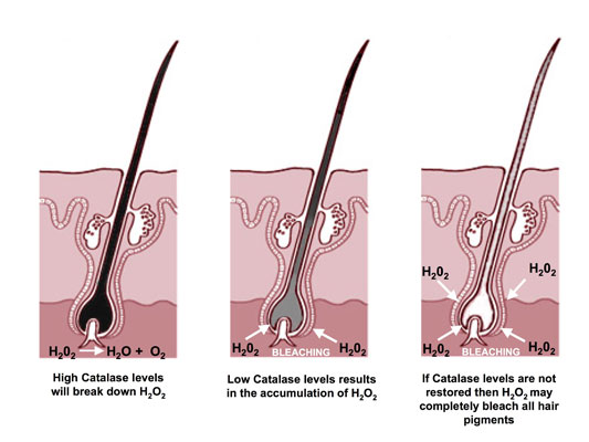 Catalase is naturally found in the body and is known to be the most powerful anti-oxidant. A single molecule of catalase can decompose millions of hydrogen peroxide molecules. Unfortunately hydrogen peroxide breaks down melanin, our natural hair pigment.
